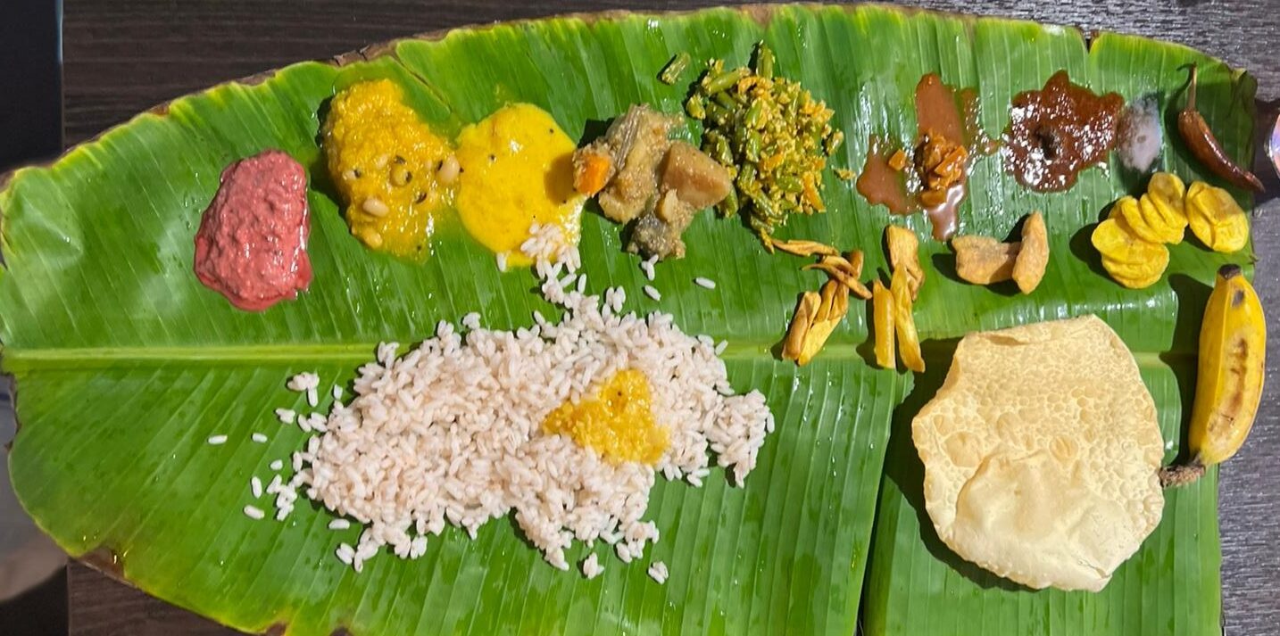 The Sadhya is a 21 item festive platter served on a banana Leaf: